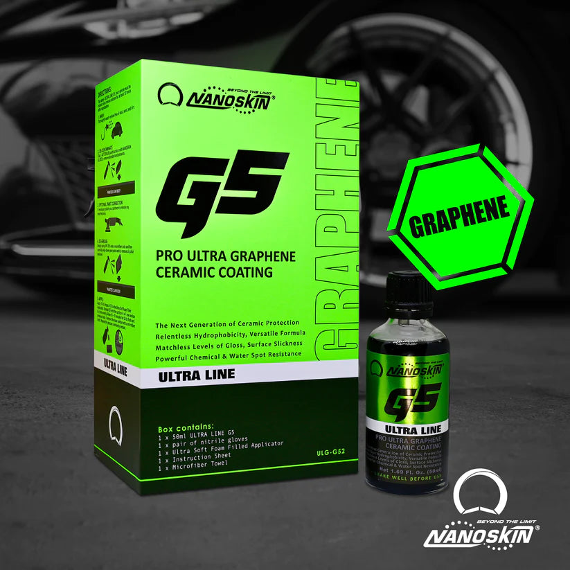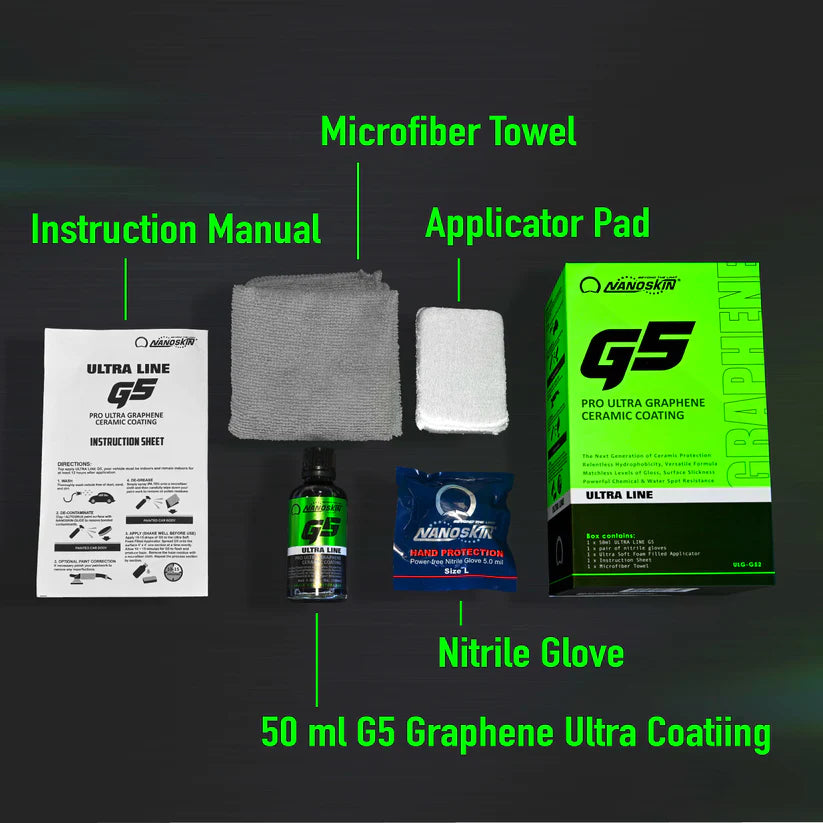 The Nanoskin G5 kit includes everything necessary to apply the coating to your vehicle. The kit includes 50ml of G5, an Ultra Soft Foam applicator, nitrile gloves, microfiber towel, and instructions, making it easy to apply the coating to any vehicle. The Nanoskin G5 kit is the complete solution for all your vehicle coating needs. With the Nanoskin G5 Graphene Ceramic Coating, you can protect your vehicle and keep it looking brand new for years to come. The coating incorporates a dual function molecule which chemically bonds to the clear coat of the vehicle. The formula uses world-renowned pure spherical silica, combined with graphene to produce a deep, reflective, mirror-like protective layer. Upgrade your vehicle's appearance and protection with Nanoskin G5, and get ready for the compliments to roll in!