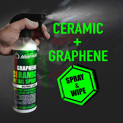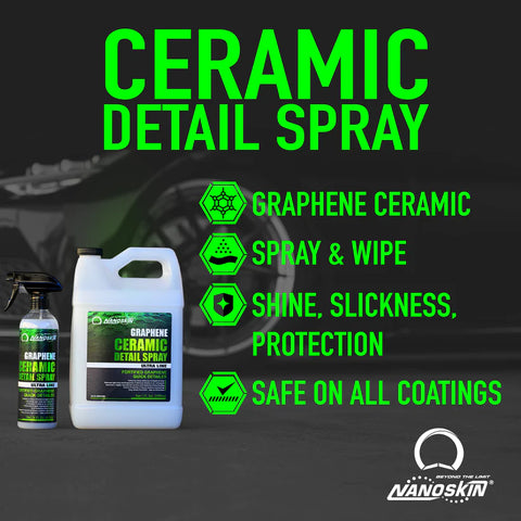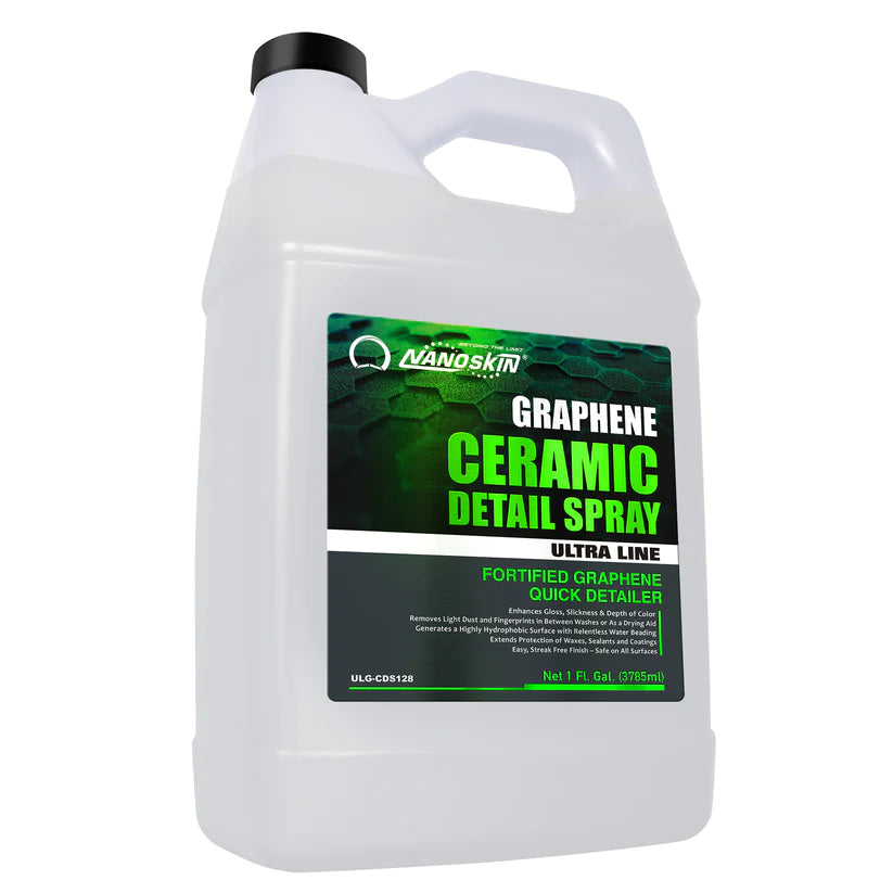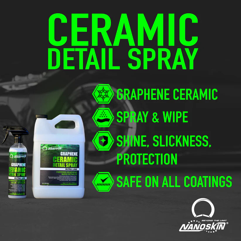 Nanoskin Graphene Ceramic Detail Spray is a hydrophobic quick detailer for car detailing and maintenance. This innovative spray is formulated with ultra-refined graphene-oxide ceramic resins that provide enhanced gloss, depth, and richness to all colors. It can be used as a top coat sealer, protection booster, and waterless wash dust cleaner. This all-purpose solution is safe to use on various surfaces, including paint, glass, chrome, wheels, grilles, and trim. It can also be used as an Autoscrub lubricant, quick polishing booster, gloss enhancer, wax booster, and even as a drying aid. This means you can get the perfect showroom shine without having to use multiple products.One of the standout features of this detail spray is its use as a clay lubricant and Autoscrub lubricant. The pre-diluted formula provides a slick surface for the clay or Autoscrub to glide over, making it easy to remove contaminants and leave a flawless finish. If you've tried using a clay bar or Autoscrub without a lubricant, you know how challenging it can be to remove all the contaminants from your paint.The proprietary blend of polymeric lubricating agents in this high-solids formula gently removes dust, fingerprints, smudges, and other contaminants, leaving a highly hydrophobic surface with ease. The infused graphene ceramic chemistry provides unequalled water beading and hydrophobic properties, making it easy to generate a highly hydrophobic surface with just a spray and swipe using a microfiber towel or cloth.Using Nanoskin Graphene Ceramic Detail Spray is easy. Simply spray it on the surface you want to clean, and wipe it off with a microfiber towel. It's that simple. This high-solids formula can be used as a maintenance spray for any graphene, ceramic, or wax-based protective coating. This makes it a versatile tool in your detailing arsenal, as it can be used for many different purposes.
