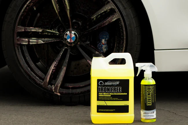 NANOSKIN IRON FREE is an acid-free, pH-balanced paint & wheel cleaner/fallout remover. IRON FREE safely breaks down ferrous metallic contamination caused by automotive brakes, rail travel, and construction. Decontaminates delicate paint, plastic, chrome, glass, and alloy wheels. IRON FREE sprays on fluorescent green and turns reddish as it reacts with the iron particulates making it easier to remove. The thick & high foaming IRON FREE formula clings to vertical surfaces. Perfectly safe for use on all types of wheels when not used in direct sun or on a hot wheel. NOT FOR USE ON NUBUCK, SUEDE, FABRIC, AND CONVERTIBLE TOPS. |