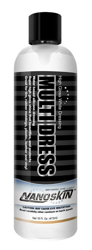MULTI DRESS High Gloss White Dressing is a semi thick, water based, silicone dressing. A super high gloss shine that beautifies, and protects. Brush or sponge application recommended. Quick dry, low sling-off formula works great on wet tires. Great for tires, rubber moldings, bumpers, and exterior trim. MULTI DRESS also imparts high gloss into interior vinyl and leather. Designed for car washes, detail shops, new car dealers, and show car enthusiasts.