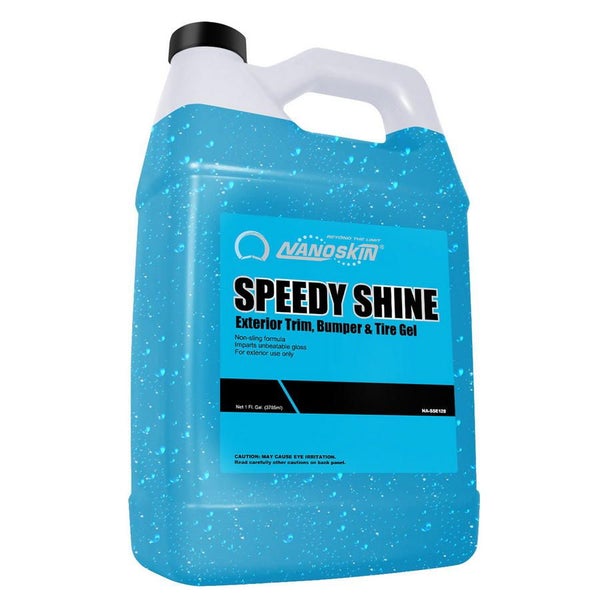 NANOSKIN SPEEDY SHINE Exterior Trim, Bumper & Tire Gel is a fast, shine-as-u-wipe shining agent. The thick, water-based suspension formula provides a high gloss shine on all exterior trium, bumper, tires and wheel wells. The ultra safe formula contains no petroleum distillates or VOCs, which are known to crack vinyl and rubber. SPEEDY SHINE’s safe, water-based formula delivers premium protection and an attractive shine. |